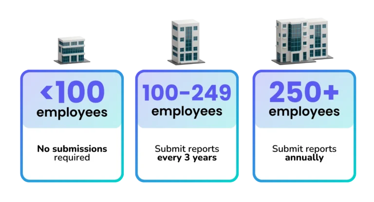 The frequency of these report submissions depends on the company size. Companies with 250+ employees need to make annual submissions, companies with 100-249 employees are required to submit every 3 years, while companies with less than 100 employees are not required to submit a report, but must still comply with the rest of the obligations.